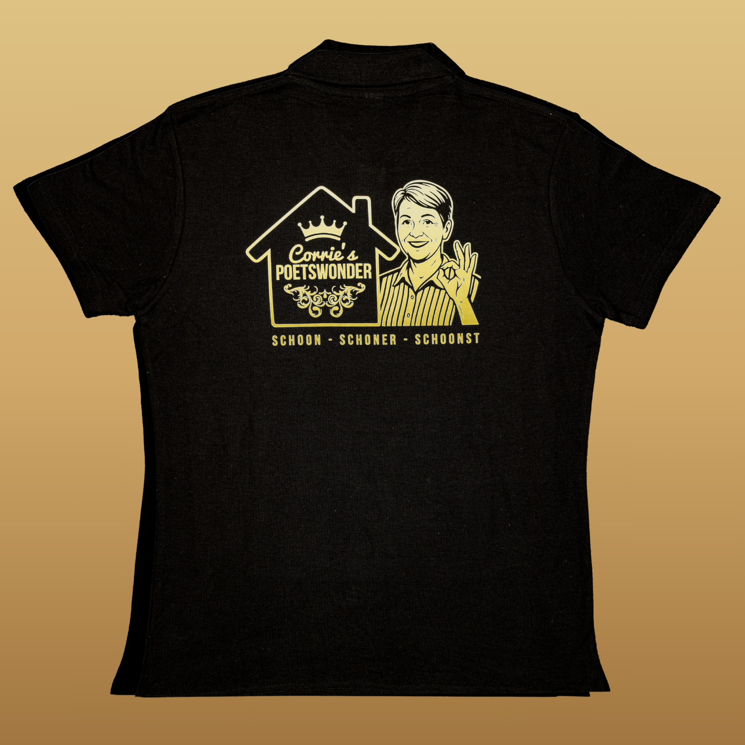 Zwart poloshirt met Corrie's Poetswonder logo.